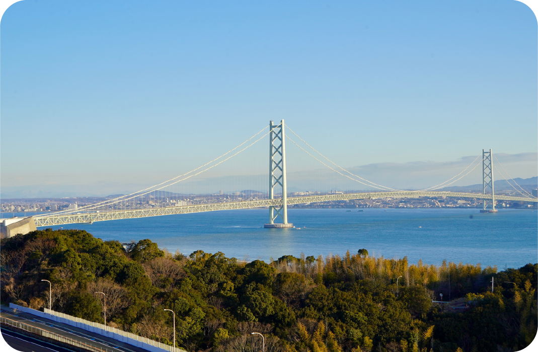 淡路島は関西・四国と道路で繋がり交通の便が良好です。明石海峡大橋を車で渡れば神戸へ15分、大阪へも1時間以内でアクセス可能です。